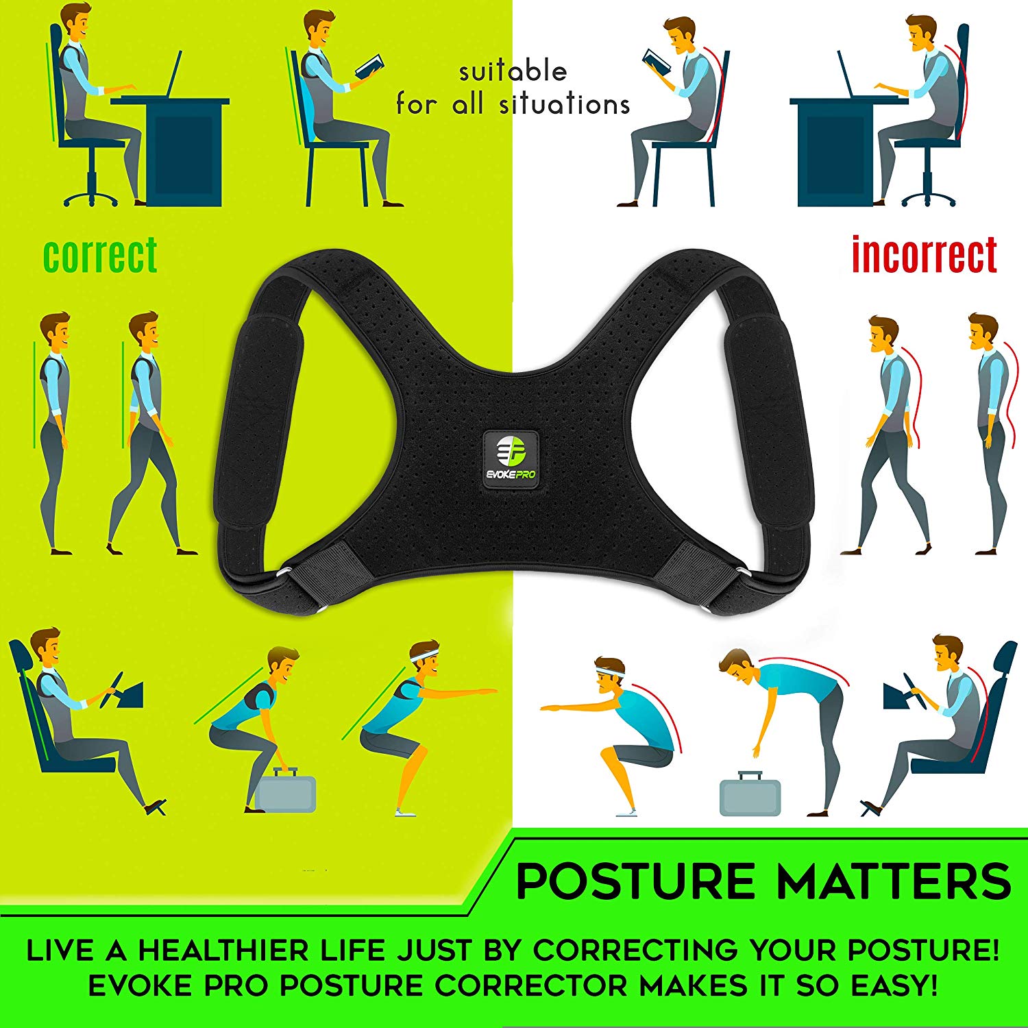 • 👍 ALL DAY COMFORT – Sleek and lightweight, Evoke Pro back brace can be worn over or under your clothes. The ergonomic design molds comfortable on your body, while the ARMPIT PADS prevent bruises, chaffing, and irritation in the critical underarm area.